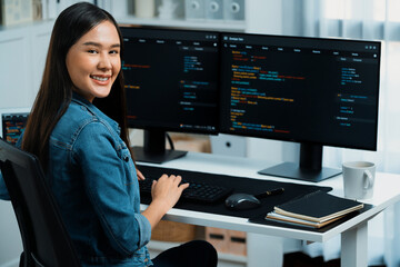 young asian in it developer looking at camera to present with online information on pc with coding p