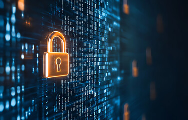 digital background featuring orange padlock icon amidst matrix of binary code, symbolizing cybersecu