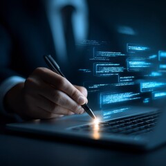 ai innovation: an individual interacts with a modern laptop, its screen filled with data visualizati
