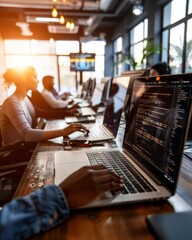 trading developer typing on laptop computer in office, ai technology development, stock market