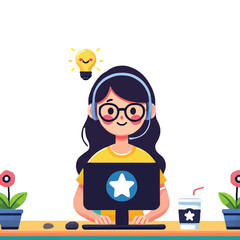 Young freelancer programmer coding with laptop. Vector geek character isolated on white background. Illustration of programmer coding, freelancer professional