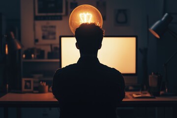 A person sits at a computer in a dimly lit room, a bright lightbulb above their head symbolizing a moment of inspiration or idea generation.