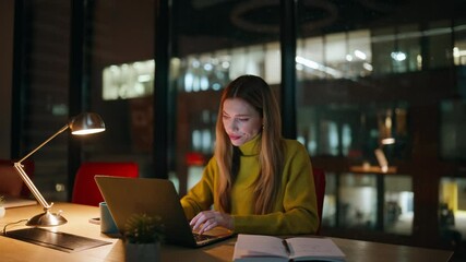 Overworked woman closing computer lid sitting night workspace. Fatigued woman