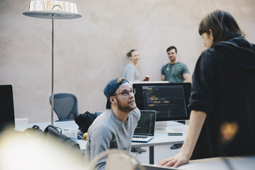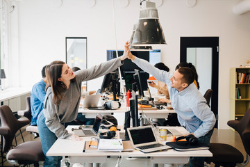 Happy male and female computer programmers doing high-five over computer at desk in creative office