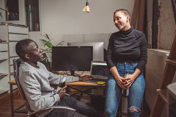 Group of business people and software developers working as a team in office. diverse coworkers collaborating and laughing together in a modern office.