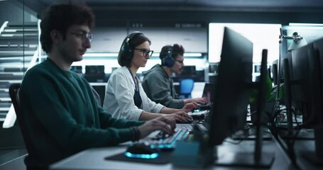 Focused Young Female Software Developer Working on Computer Together with Two Creative Male Colleagues. Data Protection Center with Servers, Storage Hardware and eBusiness Research