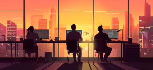 Programmers in the office work in a big city, work on an application, sit with their backs Generative AI