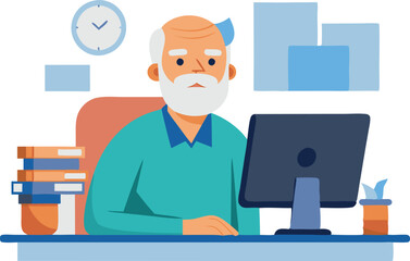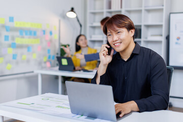 Smiling businessman working on a laptop computer in a modern office,doing finances, accounting analysis, report data pointing graph Freelance education and technology concept.
