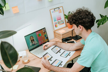 Developers coding on laptops with web design elements and programming graphics present in modern workspace setting