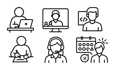 Line style icons of remote worker personas: solo freelancer desk, team lead on video call, remote developer screen, content writer icon, virtual assistant headset, product manager calendar, marketing