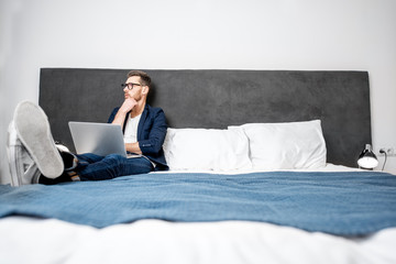businessman dressed casually working with laptop at the hotel room or bedroom