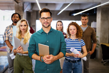 people, portrait and computer with smile for teamwork or collaboration as web developers. employee,