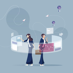 beautiful female mobile gaming application developer talks with her male colleague, they discuss cre