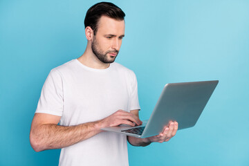 portrait of nice young person attentively look hands hold laptop coworking isolated on blue color ba