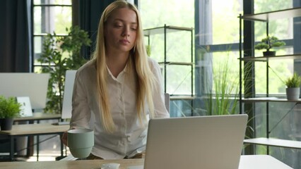caucasian businesswoman come to office sit at desktop female manager programmer girl woman drink cof