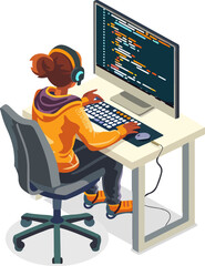 illustration design of a female programmer at work in vectorial, woman on the computer