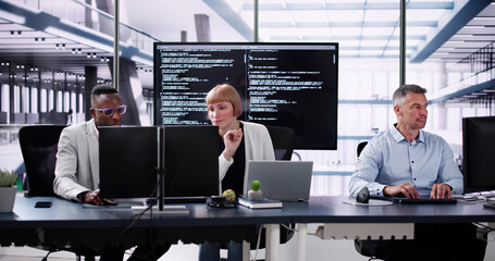 software developer sitting at desk with multiple screens and laptop running code talking with collea
