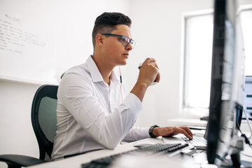 Front view portrait of bearded software programmer looking at computer screen with focused face expression while working in office