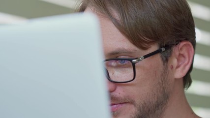 Male eyes in eyeglasses in front of laptop. Coder, programmer or developer using laptop. Close up of glasses with reflection of computer screen