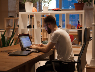 Man working on computer in cozy home office with natural light. Back view. Remote work from home, telecommuting, freelance