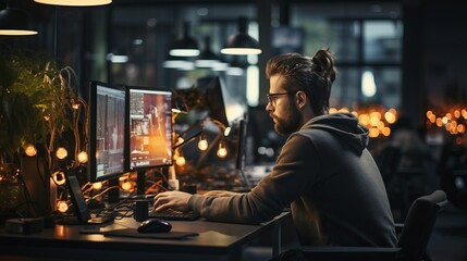 Rear photo of smart skilled young man worker qa engineer testing open data code typing keyboard looking computer monitors in office room