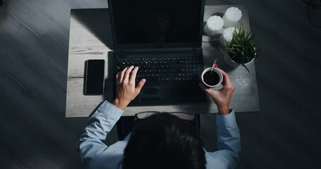 Top view of businessman person typing on a laptop computer. The laptop is on a table with a cup of coffee and a potted plant. The person is wearing a blue shirt