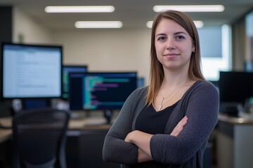 Woman IT programmer developer concentrating on a project in a modern office setting, with code displayed on screens and a blurred background of colleagues workspace