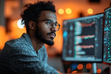 Young software developer wearing glasses, focused on multiple computer screens with code and data in a dimly lit workspace