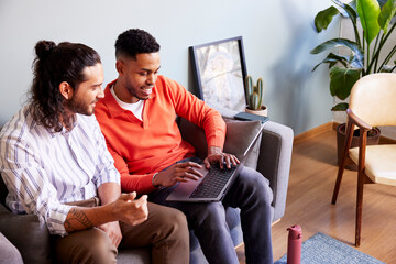 Diverse team of software developers collaborating on user interface design on laptop in modern office
