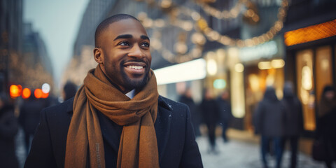Happy black businessman in London city in winter. Concept of business, success and entrepreneurship.