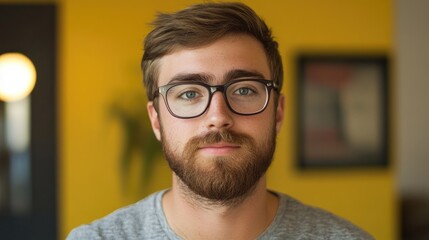 Focused programmer with glasses and a beard, showcasing a determined expression in a bright, modern workspace.