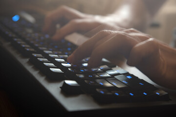 man's hands are typing on the keyboard at home. remote work of a programmer close up.