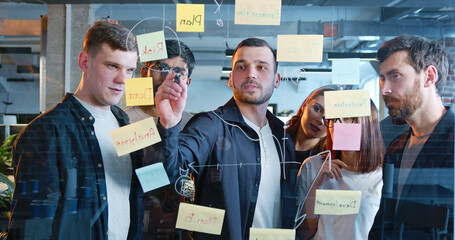 diverse people of startup project standing in front of board with tasks and to-do notes, drawing cha