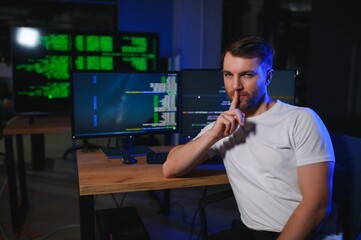 tech startup programmer digital innovator. portrait of young guy. software coding man computer in of