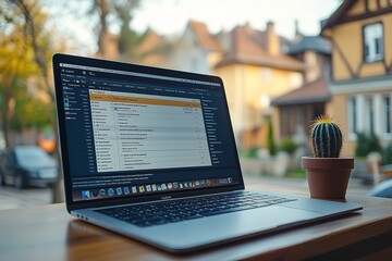 a laptop is open on a table with a potted cactus next to it