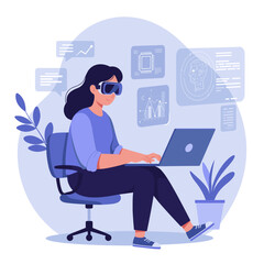 a woman wearing ar/vr goggles works on a computer surrounded by symbols of programming, ai, and digi