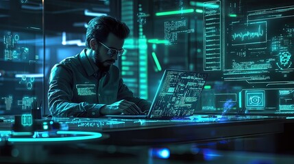Futuristic Tech Innovator at Work: Bearded Man Analyzing Data in Neon Glow