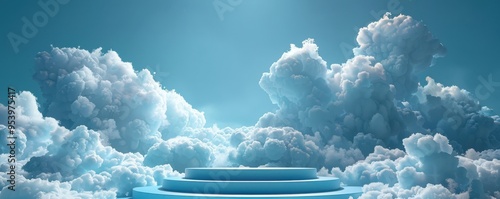 The watermark will not be included on Poster.: 3d blue podium surrounded by fluffy clouds under a serene sky - free copy space for text -