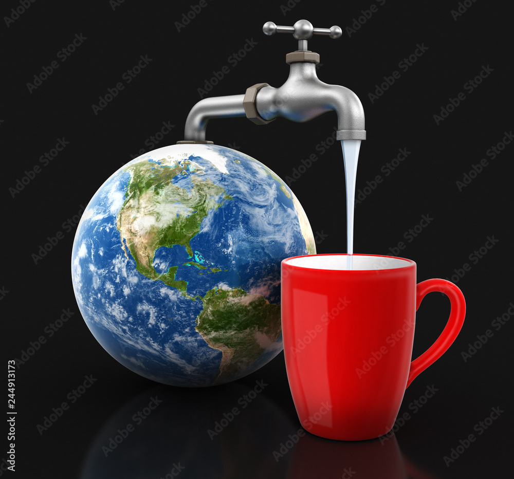 The watermark will not be included on Poster.: 3d globe with water tap with cup - image with clipping path