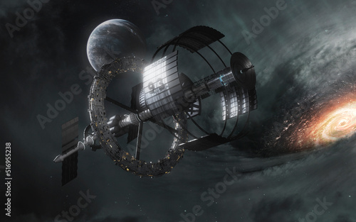 Poster 3d illustration of space station in deep space. 5k realistic science fiction art. elements of image