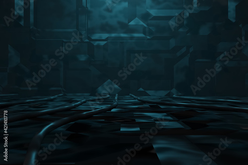 Poster 3d rendering of cyberpunk word phrase the end illuminated in orange in metal background. artificiall