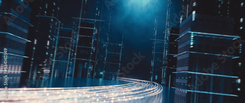 Poster 3d rendering of light path trail running through digital sci-fi hologram buildings in city. for next