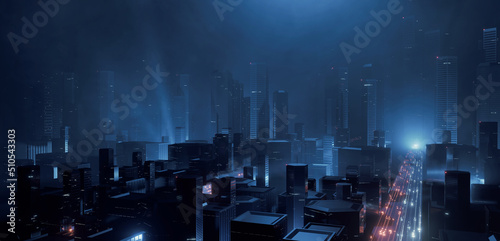 The watermark will not be included on Poster.: 3d rendering of trail lights from highway and light reflection from buildings in mega city at night -