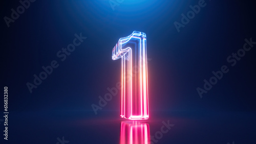 Poster 3d rendering. neon number one. glowing colorful line inside the glass symbol 1 shape. top chart