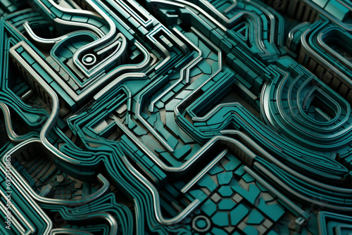 The watermark will not be included on Poster.: A 3d composition of intricate geometric patterns in a blend of turquoise and platinum, forming a mes
