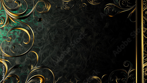 A black and gold background with a green and gold swirl pattern on it and a black backgroundPoster