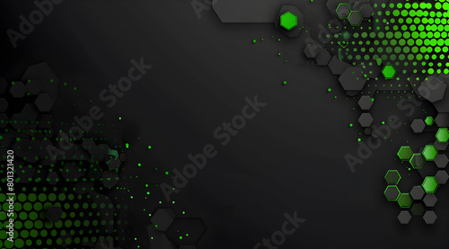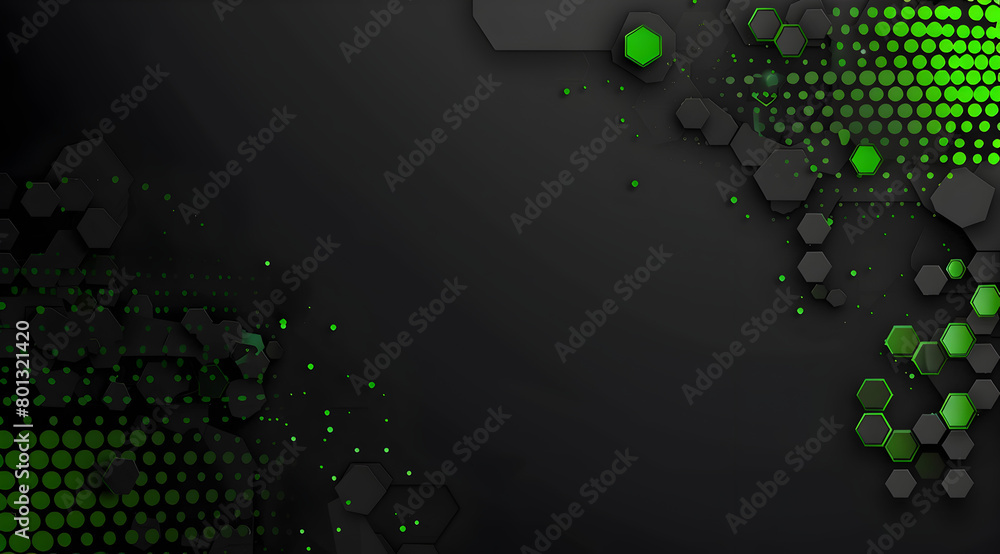 Poster a black and green background with a lot of dots and hexagons. generative ai
