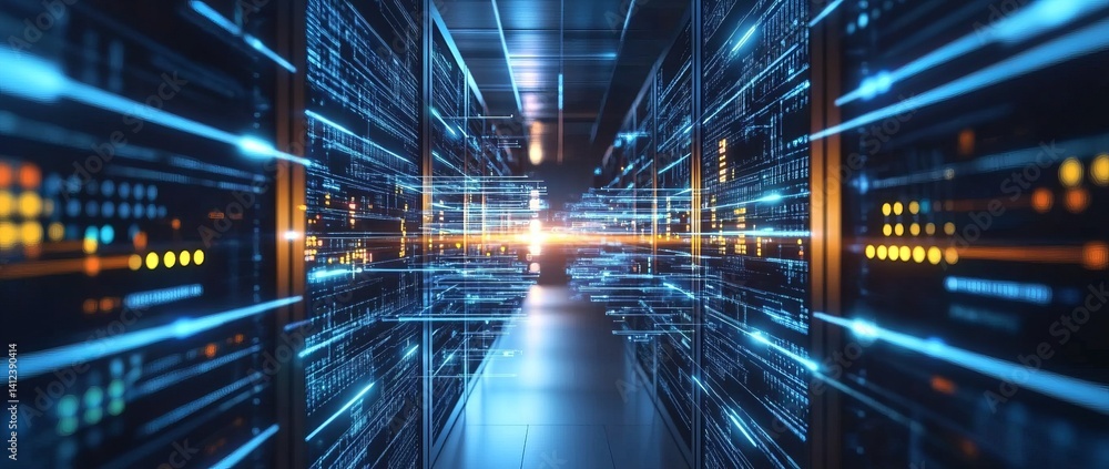 Poster : A blue and white image of a network of lines and dots, blue technology background with circuit board