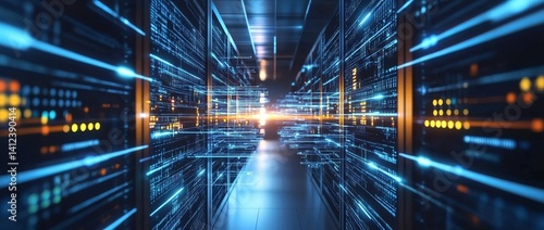 Poster a blue and white image of a network of lines and dots, blue technology background with circuit board