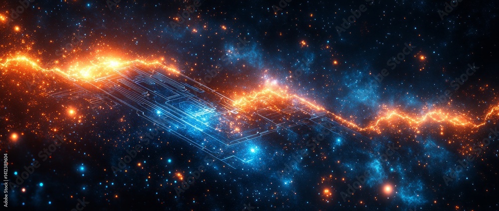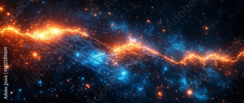 Poster a blue and white image of a network of lines and dots, blue technology background with circuit board